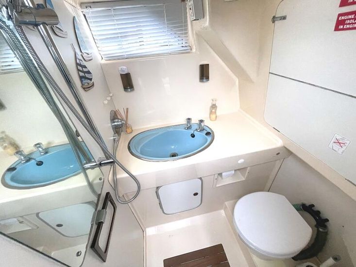 Domestic comfort is ensured by two new Sani Marin electric toilets and new thermostatic shower units, as well as new carpets and upholstery. On-deck handling is made effortless by a recently added bow thruster and a new Quick Prince DP2 electric windlass. Boasting a brand-new full canopy, this vessel has also just benefited from a full compound and polish, fresh antifoul, and a complete engine service, leaving her in true turn-key condition. With her signature full-beam aft master cabin and versatile three-door access, she is a remarkably well-specified example ready for immediate adventure.