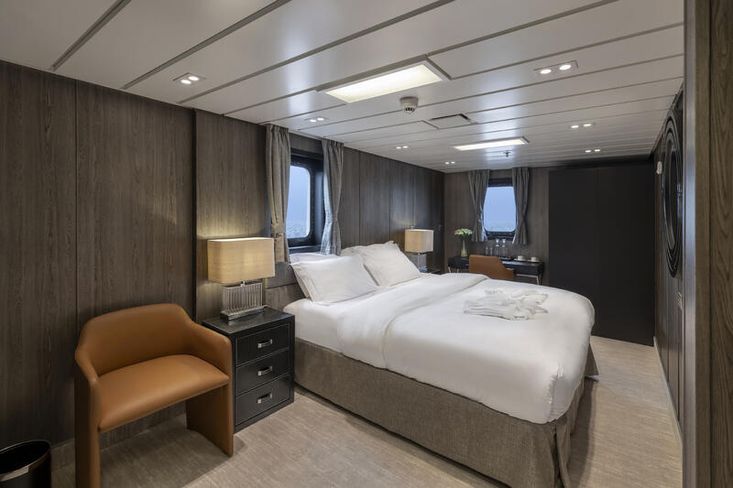 The ship underwent its latest refit in 2019 when it was purchased by the present owners. The entire ship was renovated inside and out. All machinery was serviced or upgraded, shafts and propellers pulled and full re-conditioned. The exterior was blasted from top to bottom, heavily primed and re-painted. The interior was completely renovated and modernized. Everything was done with the goal of being as energy efficient and eco-friendly as possible. New bilge water treatment and power management systems were installed. The aft deck pool was converted to a laboratory. The ship is in excellent condition operationally and visually.